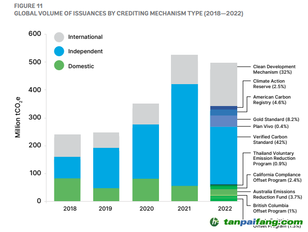據(jù)世界銀行發(fā)布的 State and Trends of Carbon Pricing 2023 報(bào)告,2022年,第三方獨(dú)立自愿減排機(jī)制再次發(fā)放了最多的碳信用,但2022年的數(shù)量有所下降,總共發(fā)放了2.75億份信用,占2022年發(fā)放的4.75億份信用的58%。與2021年相比,發(fā)放的信用量減少了22%。