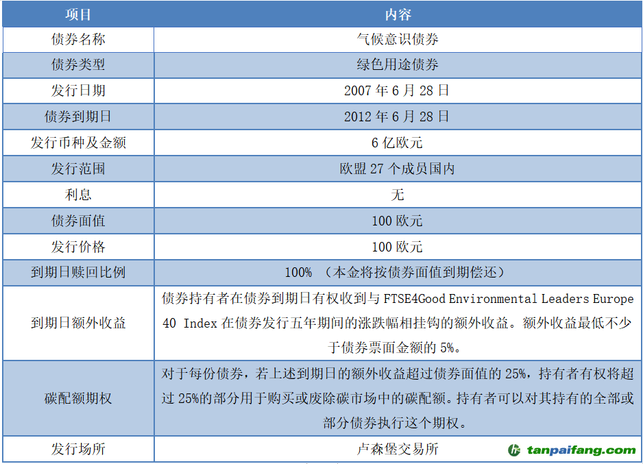 2007年7月,歐洲投資銀行(European Investment Bank, EIB)發(fā)行了世界上第一只氣候意識(shí)債券(Climate Awareness Bond, CAB),該債券也是全球的首只
