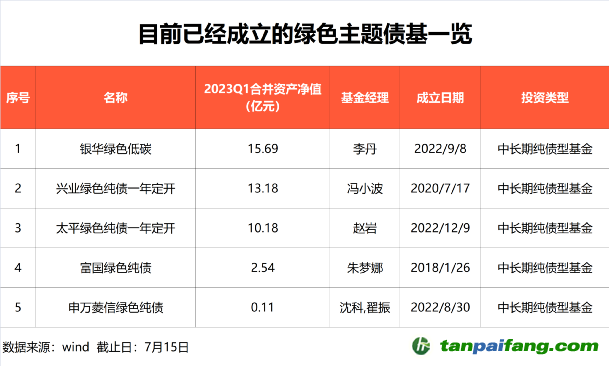 事實(shí)上,從2018年開始,我國(guó)就開始布局綠色主題債券基金,比如富國(guó)綠色純債、興全綠色純債一年定開等產(chǎn)品,目前全市場(chǎng)共計(jì)有10家基金公司布局綠色主題債基,5家公募已經(jīng)設(shè)立,截至今年一季度末,上述產(chǎn)品總規(guī)模達(dá)41.7億元。 禸嫆@唻洎:狆國(guó)湠棑倣茭昜蛧 τāńpāīfāńɡ.cōm