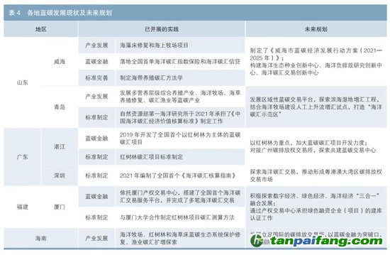 近年來(lái),山東省、廣東省、福建省、海南省這幾個(gè)海洋資源較豐富的地區(qū)發(fā)力藍(lán)碳領(lǐng)域,大力發(fā)展海藻床修復(fù)、紅樹林系統(tǒng)保護(hù)、海上牧場(chǎng)等產(chǎn)業(yè)豐富藍(lán)碳資源,同時(shí)依托當(dāng)?shù)氐母咝:脱芯克?,完善藍(lán)碳相關(guān)產(chǎn)業(yè)的碳匯標(biāo)準(zhǔn)。其中,部分地區(qū)已經(jīng)開展了藍(lán)碳金融實(shí)踐。威海市落地了全國(guó)首單海洋碳匯指數(shù)保險(xiǎn)和海洋碳匯信貸;湛江市開發(fā)了全國(guó)首個(gè)以紅樹林為主體的藍(lán)碳碳匯項(xiàng)目;廈門市搭建了全國(guó)首個(gè)海洋碳匯交易服務(wù)平臺(tái)并完成多筆碳匯交易。但總體來(lái)看,藍(lán)碳交易仍然處于發(fā)展初步階段(見表4)。未來(lái)山東省、廣東省、福建省、海南省都將深耕藍(lán)碳金融領(lǐng)域,從頂層設(shè)計(jì)、平臺(tái)搭建和項(xiàng)目開發(fā)等方面爭(zhēng)奪藍(lán)碳金融發(fā)展的制高點(diǎn)。 本+文`內(nèi)/容/來(lái)/自:中-國(guó)-碳-排-放-網(wǎng)-tan pai fang . com