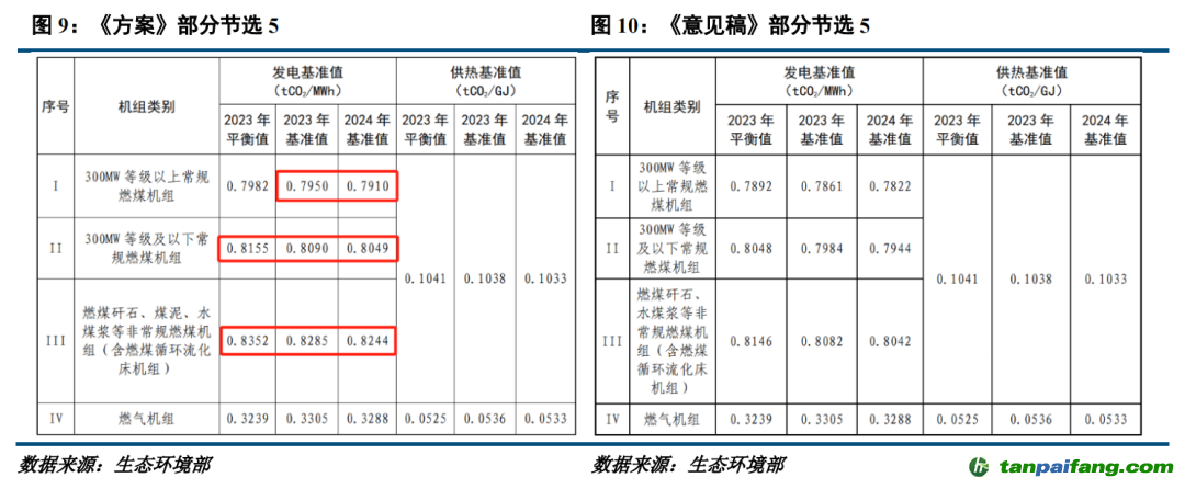 對比7月發(fā)布的意見稿,近期23、24年最終方案有三大重要變化。1)取消了冷卻方式修正系數(shù),主因是配額計算由基于供電量調(diào)整為發(fā)電量,北方用電多,收益較大,故取消之前的補償系數(shù)以追求公平性;2)燃氣機組平衡值、基準值同步上調(diào),但2024年收緊幅度仍在0.5%左右,約束力度不改;3)配額結(jié)轉(zhuǎn)規(guī)則引入基礎(chǔ)可結(jié)轉(zhuǎn)量,其對碳價的沖擊一定程度減輕。 本+文+內(nèi)/容/來/自:中-國-碳-排-放(交—易^網(wǎng)-tan pai fang . com