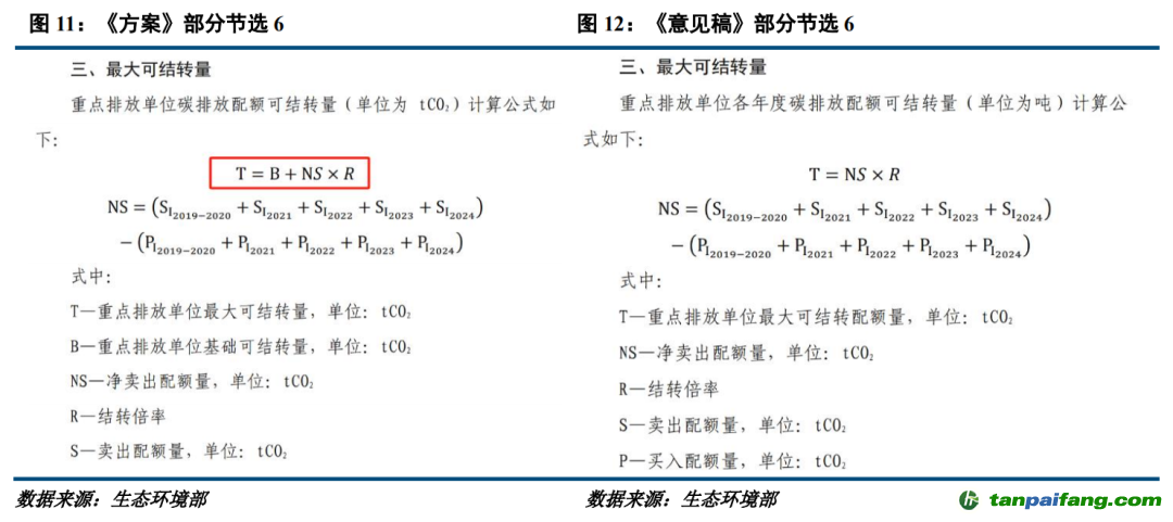 可結(jié)轉(zhuǎn)量引入常數(shù)(基礎(chǔ)可結(jié)轉(zhuǎn)量),結(jié)轉(zhuǎn)政策優(yōu)化。對比7月2日的《意見稿》,《方案》中的可結(jié)轉(zhuǎn)量計算公式有所變化,引入了基礎(chǔ)可結(jié)轉(zhuǎn)量B,重點排控單位可無條件獲得10000噸結(jié)轉(zhuǎn)量,交易方式更加靈活,能夠有效解決盈余企業(yè)惜售、配額缺口履約壓力大、交易不活躍等問題。結(jié)轉(zhuǎn)策略方面,對于配額盈余10000噸以上的部分,企業(yè)可以出售該部分配額的40%,以獲得剩余60%配額的結(jié)轉(zhuǎn)資格,避免盈余配額浪費。 本@文$內(nèi).容.來.自:中`國`碳`排*放^交*易^網(wǎng) t a np ai fan g.c om