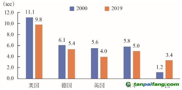 值得關(guān)注的是,20世紀(jì)90年代以來,隨著全球氣候變化問題提上日程,發(fā)達(dá)國家紛紛意識到只有降低能源消費,才能減少二氧化碳排放,同時為加快化石能源替代創(chuàng)造條件。美國、德國、英國、日本等發(fā)達(dá)國家紛紛加大對節(jié)能和提高能效的重視,采取措施努力降低本國能源消費。經(jīng)過近20年的努力,美國的人均能源消費量從2000年的11.1?tce下降到2019年的9.8?tce,下降11.9%;德國從2000年的6.1?tce下降到2019年的5.4?tce,下降12%;英國人均能源消費量從2000年的5.6?tce下降到2019年的4.0?tce,下降29%;日本從2000年的5.8?tce下降到2019年的5.0?tce,下降14%。人均能源消費量和本國能源消費總量的下降,為這些國家減排二氧化碳做出了重要貢獻(xiàn)。圖2 2000年與2019年中國和典型發(fā)達(dá)國家人均能源消費量 來源:BP能源統(tǒng)計。