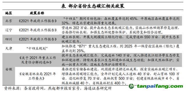 另外,地方政府關(guān)于清潔能源、碳匯的措施還在布局中,北京、遼寧等各地政府在2021年政府工作報告中重點提出要“提高碳匯能力”。 本+文+內(nèi)/容/來/自:中-國-碳-排-放(交—易^網(wǎng)-tan pai fang . com