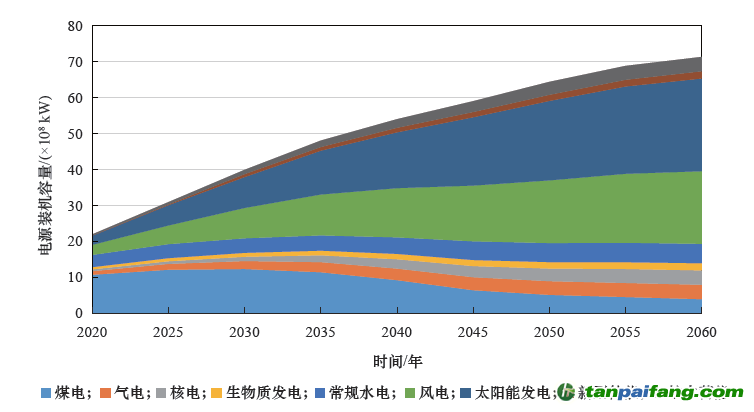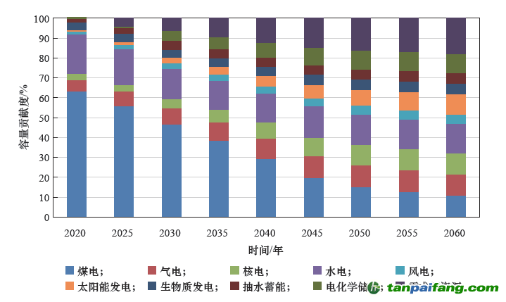 圖14 2020—2060 年我國各類電源電力平衡貢獻(xiàn)圖 本+文`內(nèi)/容/來/自:中-國-碳-排-放-網(wǎng)-tan pai fang . com