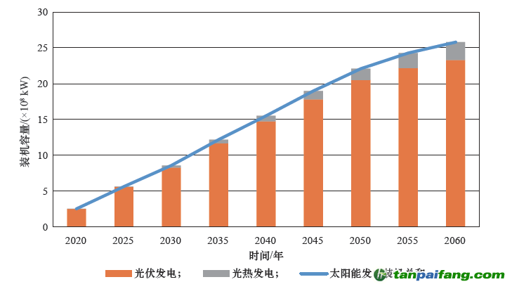在風(fēng)電方面,近期應(yīng)因地制宜發(fā)展東部、中部地區(qū)的分散式風(fēng)電和海上風(fēng)電,優(yōu)先就地消納,同時(shí)穩(wěn)步推進(jìn)西部、北部地區(qū)的風(fēng)電基地集約化開發(fā);遠(yuǎn)期隨著東部、中部地區(qū)的分散式風(fēng)電資源基本開發(fā)完畢,風(fēng)電開發(fā)重心重回西部、北部地區(qū),同時(shí)海上風(fēng)電逐步向遠(yuǎn)海拓展,預(yù)計(jì)2060 年風(fēng)電裝機(jī)容量為2×109 kW(含海上風(fēng)電的5×108 kW)。在太陽能方面,近期仍以光伏發(fā)電為主導(dǎo),優(yōu)先發(fā)展東部、中部地區(qū)的分布式光伏,西部、北部地區(qū)則推動(dòng)建設(shè)集中式太陽能發(fā)電基地;中遠(yuǎn)期,包括光熱發(fā)電在內(nèi)的太陽能發(fā)電基地建設(shè)將在西北地區(qū)及其他有條件的區(qū)域持續(xù)擴(kuò)大規(guī)模,預(yù)計(jì)2060 年太陽能裝機(jī)容量為2.6×109 kW( 含光熱發(fā)電的2.5×108 kW)。
