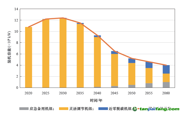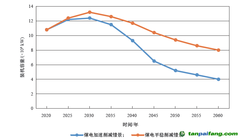 ①“增容控量”階段。“十四五”時(shí)期煤電發(fā)展難以“急剎車”,裝機(jī)容量仍需有一定的增長,在此基礎(chǔ)上要嚴(yán)控發(fā)電量增長;裝機(jī)容量峰值約為1.25×109 kW,發(fā)電量先于裝機(jī)2~3 a 達(dá)峰,峰值約為5.1×1012 kW·h;新增煤電主要發(fā)揮高峰電力平衡和應(yīng)急保障作用并提供轉(zhuǎn)動(dòng)慣量,保障電力系統(tǒng)安全穩(wěn)定運(yùn)行。 內(nèi)-容-來-自;中_國_碳_0排放¥交-易=網(wǎng) t an pa i fa ng . c om