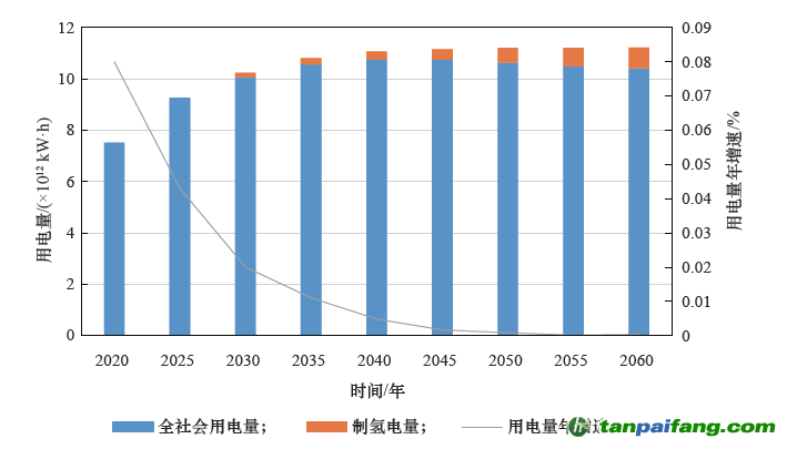 圖3 2020—2060 年全社會(huì)用電量預(yù)測(cè)結(jié)果 本+文內(nèi).容.來.自:中`國`碳`排*放*交*易^網(wǎng) ta np ai fan g.com