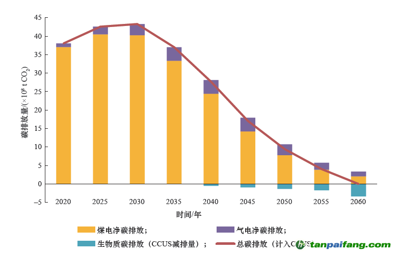 ③“減容減量”階段。2030 年以后,煤電裝機(jī)和發(fā)電量穩(wěn)步下降,一部分逐步退出常規(guī)運(yùn)行而作為應(yīng)急備用;遠(yuǎn)期加裝CCUS 設(shè)備,逐步增加“近零脫碳機(jī)組”并形成碳循環(huán)經(jīng)濟(jì)發(fā)展新模式;2060 年煤電裝機(jī)降至4×108 kW,相應(yīng)占比下降為5.6%。 本`文內(nèi).容.來.自:中`國`碳`排*放*交*易^網(wǎng) t a npai fan g.com