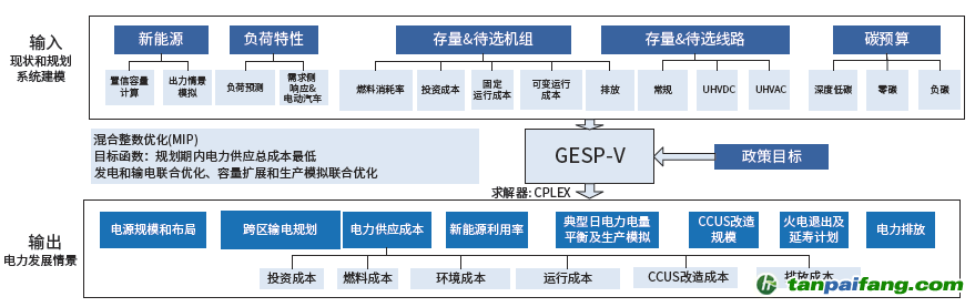 ③電力碳減排轉(zhuǎn)型路徑優(yōu)化(見圖1)。針對(duì)設(shè)計(jì)的3 類發(fā)展情景,采用碳達(dá)峰、碳中和電力規(guī)劃軟件包GESP-V 來優(yōu)化獲得電源結(jié)構(gòu)轉(zhuǎn)型路徑、電力系統(tǒng)碳減排路徑、電力供應(yīng)成本等。GESP-V 由國網(wǎng)能源研究院有限公司自主開發(fā),以包含新能源在內(nèi)的多區(qū)域電力規(guī)劃模型為核心,可反映電力電量平衡、碳排放約束、碳捕集改造、電制氫等減碳與新能源利用等關(guān)鍵技術(shù)的影響;集成電源規(guī)劃、生產(chǎn)模擬、政策分析等系統(tǒng)工具,可針對(duì)各類情景下的能源電力發(fā)展路徑、電源發(fā)展規(guī)模布局、電力流向規(guī)模、傳統(tǒng)電源CCUS 改造后的捕集規(guī)模、電力碳減排路徑等開展優(yōu)化分析。 本`文內(nèi).容.來.自:中`國`碳`排*放*交*易^網(wǎng) t a npai fan g.com