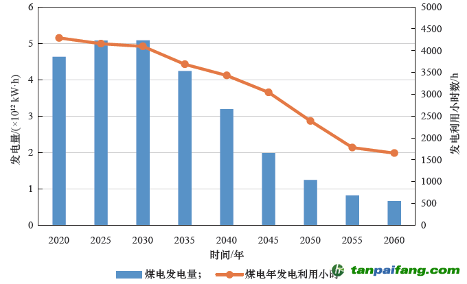 圖10 零碳情景下2020—2060 年煤電發(fā)電量及利用小時(shí)數(shù) 內(nèi)-容-來-自;中_國_碳_0排放¥交-易=網(wǎng) t an pa i fa ng . c om