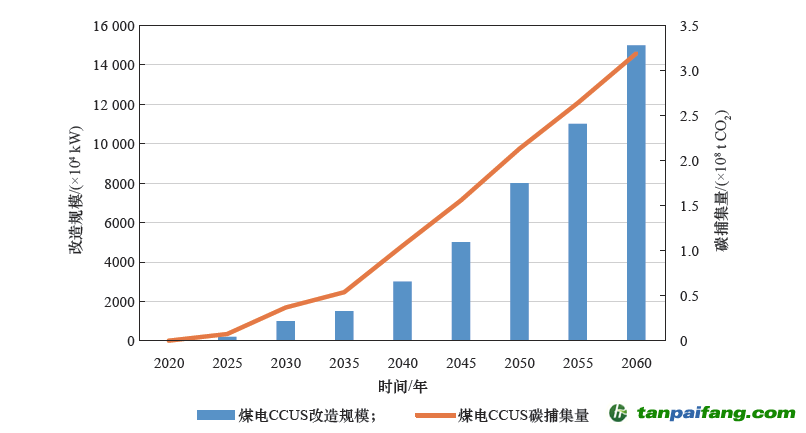 圖11 零碳情景下煤電CCUS 改造規(guī)模及碳捕集量 禸*嫆唻@洎:狆國湠棑倣茭昜蛧 τāńpāīfāńɡ.cōm
