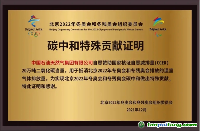 1月4日,中國石油收到了一份特殊“榮譽(yù)”——由北京冬奧組委頒發(fā)的“碳中和特殊貢獻(xiàn)證明”牌匾,因其自愿贊助20萬噸國家核證自愿減排量(