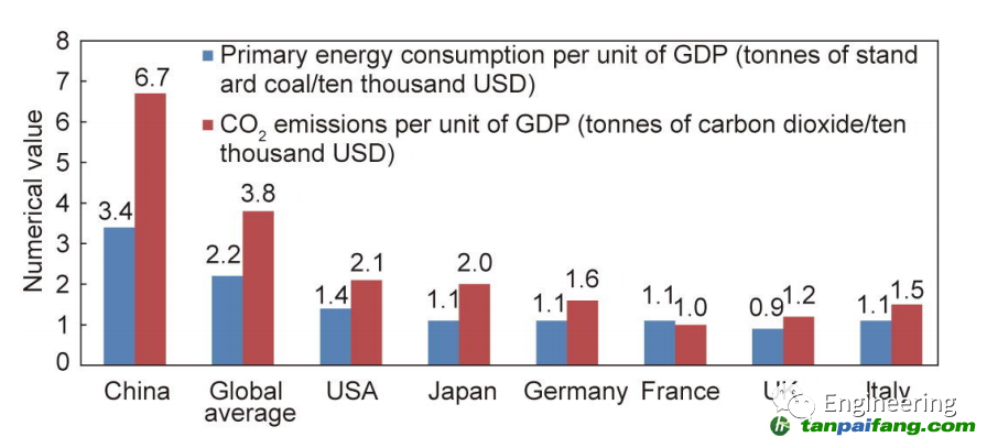 圖1. 2020年主要國家單位GDP能耗和二氧化碳排放量。 本*文@內(nèi)-容-來-自;中_國_碳^排-放*交-易^網(wǎng) t an pa i fa ng . c om
