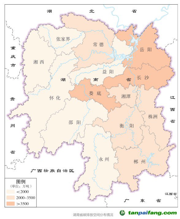 湖南省碳排放量總體呈現(xiàn)東高西低特點(diǎn),其中長(zhǎng)沙、婁底、岳陽碳排放量高于3500萬噸;婁底、湘潭碳排放強(qiáng)度最高,高于1.0噸/萬元,長(zhǎng)沙、永州碳排放強(qiáng)度最低,低于0.5噸/萬元。