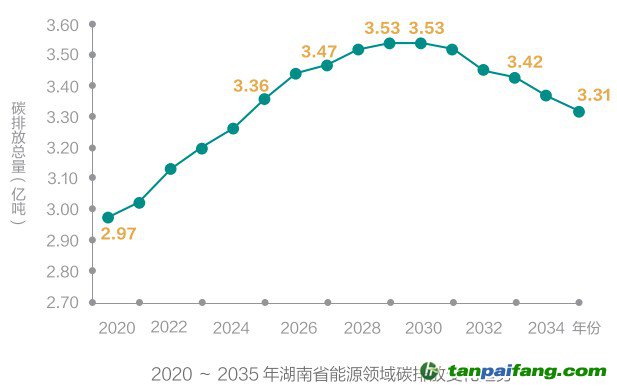 《報(bào)告》認(rèn)為,目前湖南省人均碳排放處于較低水平,處于工業(yè)化中后期階段,碳排放總量仍將隨著工業(yè)化進(jìn)程逐年上升,預(yù)測(cè)湖南能源領(lǐng)域碳排放與2029—2030年內(nèi)實(shí)現(xiàn)達(dá)峰,達(dá)峰峰值約3.53億噸。