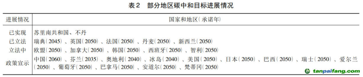 作為一種新生的綠色理念,“雙碳”積極促進(jìn)產(chǎn)業(yè)鏈革新升級,越來越多的國家在制定國家戰(zhàn)略時考慮到碳中和的因素,已有120多個國家及地區(qū)根據(jù)自身國情提出了切實可行的“雙碳”達(dá)成路線(見表2),“雙碳”的理念得到了國際社會的廣泛接受。