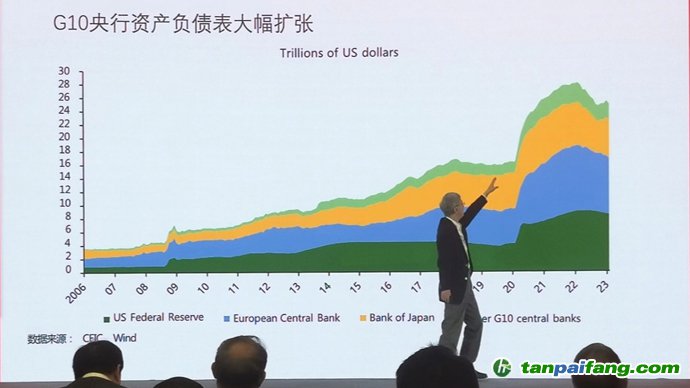 他用一組世界經(jīng)濟(jì)和金融的統(tǒng)計(jì)圖表做了對比分析,并總結(jié)道:今年起,全球經(jīng)濟(jì)由低通脹、低利率、低增長、高債務(wù),轉(zhuǎn)向高通脹、高利率、高債務(wù)、低增長。“這是一個趨勢。”