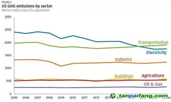 交通運輸連續(xù)3年成為美國最大的排放源。電力部門排放量在連續(xù)五年下降之后逐漸上升。自2010年經(jīng)濟(jì)從大衰退中復(fù)蘇以來,工業(yè)排放量同比增長最為強(qiáng)勁,而甲烷排放量在石油和天然氣產(chǎn)量擴(kuò)大的推動下繼續(xù)增長。