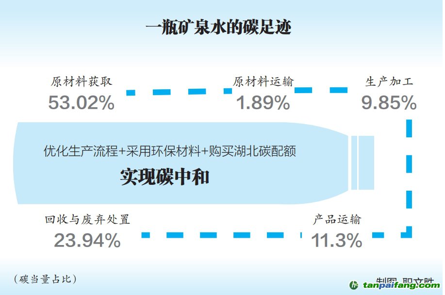 報(bào)告顯示:每生產(chǎn)一瓶550毫升的礦泉水,需要經(jīng)過原材料獲取、原材料運(yùn)輸、生產(chǎn)加工、產(chǎn)品運(yùn)輸以及回收與廢棄處置五個(gè)關(guān)鍵環(huán)節(jié),共產(chǎn)生碳足跡總值為232.4克二氧化碳當(dāng)量。其中,原材料獲取階段的碳排放量,約占碳足跡總值的一半;回收與廢棄處置階段,約占碳足跡總值的1/4,這進(jìn)一步說明礦泉水瓶的回收利用及廢棄物處理面臨很大的環(huán)保壓力。 夲呅內(nèi)傛萊源?。骇鎲┨?排*放^鮫*易-網(wǎng) τā ńpāīfāńɡ.cōm