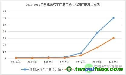 自2009年以來,全國90來個城市成為示范城市,其中上海、杭州和北京推廣數(shù)量遠遠領(lǐng)先于其他城市。雖然推廣效果參差不齊,但總體上新能源汽車推廣量還是呈現(xiàn)上升趨勢。隨著各地獎勵機制與推廣力度的加強,新能源汽車產(chǎn)量也隨之增加。從下圖表可以看出,從2010年開始,新能源汽車產(chǎn)量與動力電池產(chǎn)能逐年遞增。2010年-2014年,新能源汽車呈現(xiàn)緩慢發(fā)展,動力電池產(chǎn)能基本與新能源汽車相差不大。但是,2015年,新能源汽車產(chǎn)量與動力電池產(chǎn)能出現(xiàn)井噴,2015年全年新能源汽車累計產(chǎn)量為37.5萬輛,動力電池產(chǎn)能達16Gwh。行業(yè)知名人士分析認為,2016年新能源汽車產(chǎn)量預(yù)計達到60萬輛,動力電池產(chǎn)能高達30Gwh。由此可以看出,新能源汽車產(chǎn)量與動力電池產(chǎn)能嚴重脫節(jié),電池產(chǎn)能遠遠趕不上新能源汽車生產(chǎn)速度,電池供需緊張。據(jù)相關(guān)專家預(yù)測,到2020年,動力電池產(chǎn)能將過剩。 本文`內(nèi)-容-來-自;中_國_碳_交^易=網(wǎng) tan pa i fa ng . c om