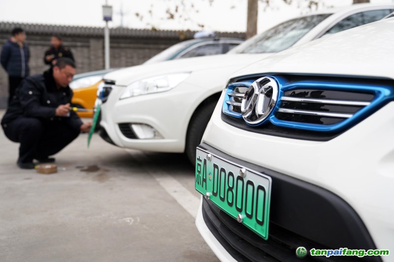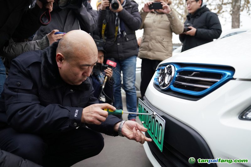 12月28日,在北京市公安局公安交通管理局車輛管理所京朝分所,工作人員為車主安裝新式新能源車號牌。 本`文@內(nèi)-容-來-自;中_國_碳排0放_交-易=網(wǎng) t an pa ifa ng . c om