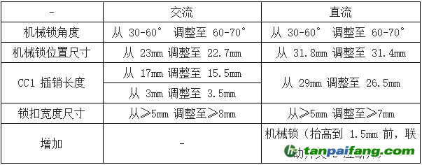 在安全性方面,新標(biāo)準(zhǔn)增加了充電接口溫度監(jiān)控、電子鎖、絕緣監(jiān)測和泄放電路等功能,細(xì)化了直流充電車端接口安全防護(hù)措施,明確禁止不安全的充電模式應(yīng)用。在兼容性方面,修改了部分觸頭和機(jī)械鎖尺寸,新舊插頭插座能夠相互配合,直流充電接口增加的電子鎖止裝置,不影響新舊產(chǎn)品間的電氣連接,用戶僅需更新通信協(xié)議版本,即可實(shí)現(xiàn)新供電設(shè)備和電動汽車能夠保障基本的充電功能。 本`文@內(nèi)-容-來-自;中_國_碳排0放_交-易=網(wǎng) t an pa ifa ng . c om