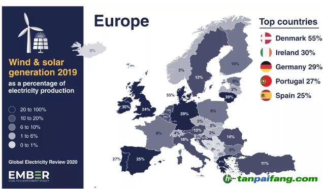 歐盟28國的風能和太陽能占發(fā)電比例高達18%,是全球平均水平的兩倍多。丹麥是領頭羊,其55%的電力來自風能和太陽能,2019年增長了7個百分點。愛爾蘭、德國、葡萄牙、西班牙也分別以30%、29%、27%、25%高于歐洲平均水平。然而,有些國家仍然遠遠落后。塞爾維亞(0%)、斯洛伐克(2%)和斯洛文尼亞(2%)風能和太陽能占比依然非常低。