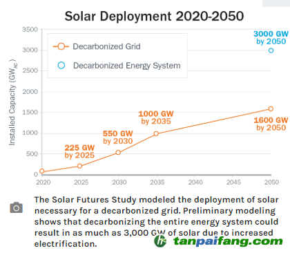 報(bào)告稱(chēng),到2035年,美國(guó)的太陽(yáng)能年發(fā)電量需要增加四倍,并向以可再生能源為主的電網(wǎng)提供1000吉瓦的電力。 到2050年,太陽(yáng)能預(yù)計(jì)提供1600吉瓦的電力,這比美國(guó)目前所有的住宅和商業(yè)建筑所消耗的電力還要多。 由于交通、建筑和工業(yè)部門(mén)電氣化的增加,到2050年,整個(gè)能源系統(tǒng)的脫碳可以產(chǎn)生多達(dá)3000吉瓦的太陽(yáng)能。