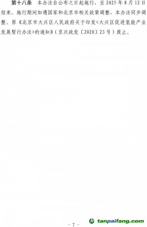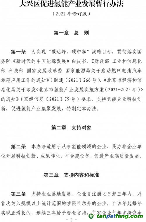 第一條為貫徹落實《大興區(qū)促進氫能產(chǎn)業(yè)發(fā)展暫行辦法(2022年修訂版)》(京興政發(fā)〔2022〕6號)(以下簡稱《暫行辦法》),支持氫能企業(yè)科技創(chuàng)新,促進氫能產(chǎn)業(yè)集聚發(fā)展,明確《暫行辦法》重點支持對象、申報材料要求等,現(xiàn)制定發(fā)布《暫行辦法》申報指南。 本`文@內-容-來-自;中^國_碳0排0放^交-易=網(wǎng) ta n pa i fa ng . co m