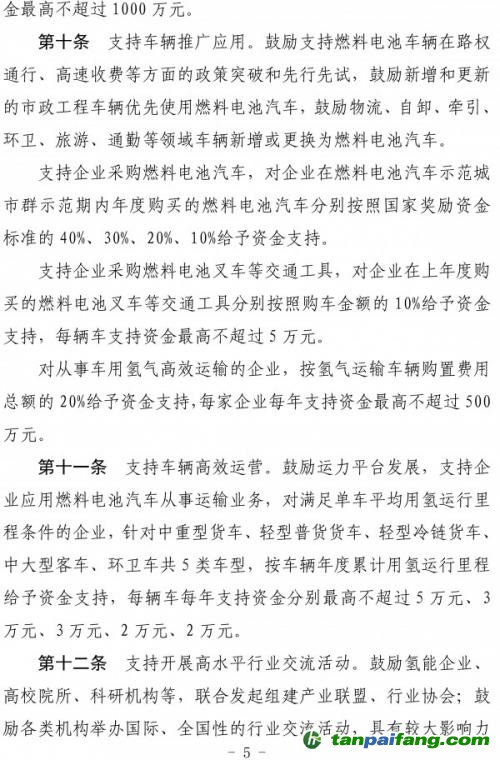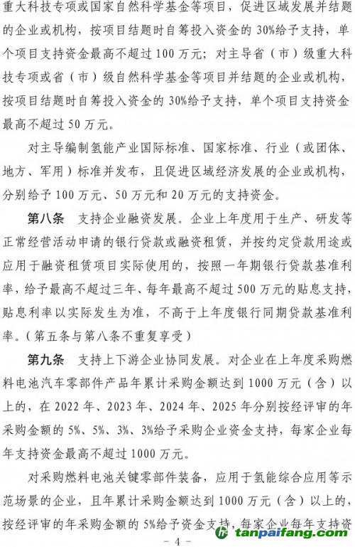 第九條支持上下游企業(yè)協(xié)同發(fā)展。對企業(yè)在上年度采購燃料電池汽車零部件產(chǎn)品年累計采購金額達到1000萬元(含)以上的,在2022年、2023年、2024年、2025年分別按經(jīng)評審的年采購金額的5%、5%、3%、3%給予采購企業(yè)資金支持,每家企業(yè)每年支持資金最高不超過1000萬元。 禸嫆@唻洎:狆國湠棑倣茭昜蛧 τāńpāīfāńɡ.cōm
