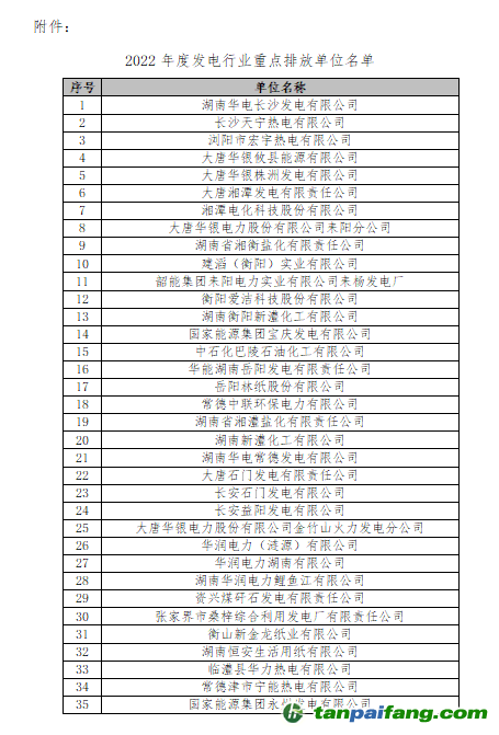 關(guān)于2022年度湖南省納入全國碳排放權(quán)交易市場發(fā)電行業(yè)重點排放單位名單公示