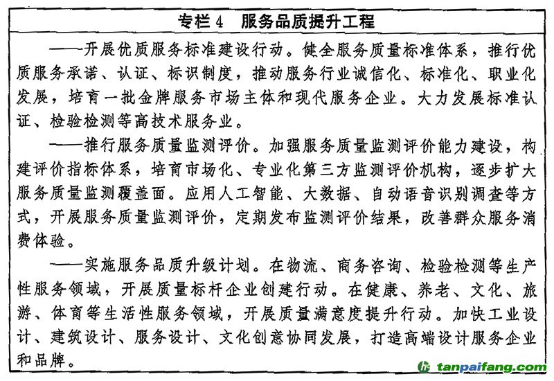 (七)提高產(chǎn)業(yè)質(zhì)量競爭水平。推動(dòng)產(chǎn)業(yè)質(zhì)量升級,加強(qiáng)產(chǎn)業(yè)鏈全面質(zhì)量管理,著力提升關(guān)鍵環(huán)節(jié)、關(guān)鍵領(lǐng)域質(zhì)量管控水平。開展對標(biāo)達(dá)標(biāo)提升行動(dòng),以先進(jìn)標(biāo)準(zhǔn)助推傳統(tǒng)產(chǎn)業(yè)提質(zhì)增效和新興產(chǎn)業(yè)高起點(diǎn)發(fā)展。推進(jìn)農(nóng)業(yè)品種培優(yōu)、品質(zhì)提升、品牌打造和標(biāo)準(zhǔn)化生產(chǎn),全面提升農(nóng)業(yè)生產(chǎn)質(zhì)量效益。加快傳統(tǒng)制造業(yè)技術(shù)迭代和質(zhì)量升級,強(qiáng)化戰(zhàn)略性新興產(chǎn)業(yè)技術(shù)、質(zhì)量、管理協(xié)同創(chuàng)新,培育壯大質(zhì)量競爭型產(chǎn)業(yè),推動(dòng)制造業(yè)高端化、智能化、綠色化發(fā)展,大力發(fā)展服務(wù)型制造。加快培育服務(wù)業(yè)新業(yè)態(tài)新模式,以質(zhì)量創(chuàng)新促進(jìn)服務(wù)場景再造、業(yè)務(wù)再造、管理再造,推動(dòng)生產(chǎn)性服務(wù)業(yè)向?qū)I(yè)化和價(jià)值鏈高端延伸,推動(dòng)生活性服務(wù)業(yè)向高品質(zhì)和多樣化升級。完善服務(wù)業(yè)質(zhì)量標(biāo)準(zhǔn),加強(qiáng)服務(wù)業(yè)質(zhì)量監(jiān)測,優(yōu)化服務(wù)業(yè)市場環(huán)境。加快大數(shù)據(jù)、網(wǎng)絡(luò)、人工智能等新技術(shù)的深度應(yīng)用,促進(jìn)現(xiàn)代服務(wù)業(yè)與先進(jìn)制造業(yè)、現(xiàn)代農(nóng)業(yè)融合發(fā)展。 本`文@內(nèi)/容/來/自:中-國^碳-排-放^*交*易^網(wǎng)-tan pai fang. com